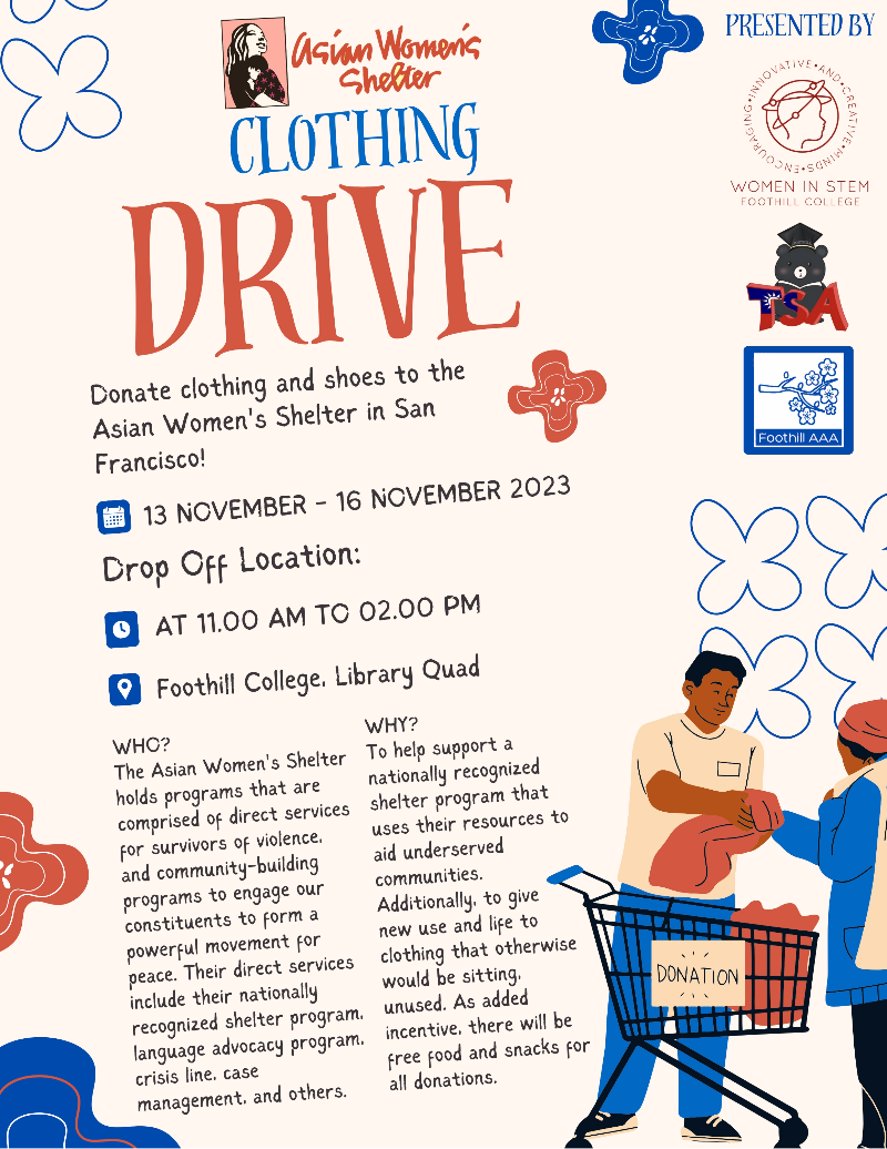 The Women in STEM Student Club is hosting a clothing drive November 13-16 from 11 a.m. — 2 p.m. in the library quad to raise funds for the Asian Women’s Shelter. Bring gently used